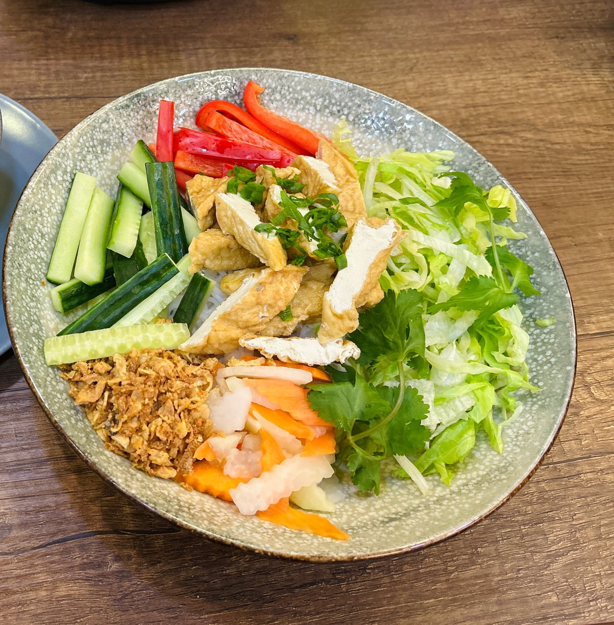 Bún Tészta, tofu jég saláta, paprika, uborka