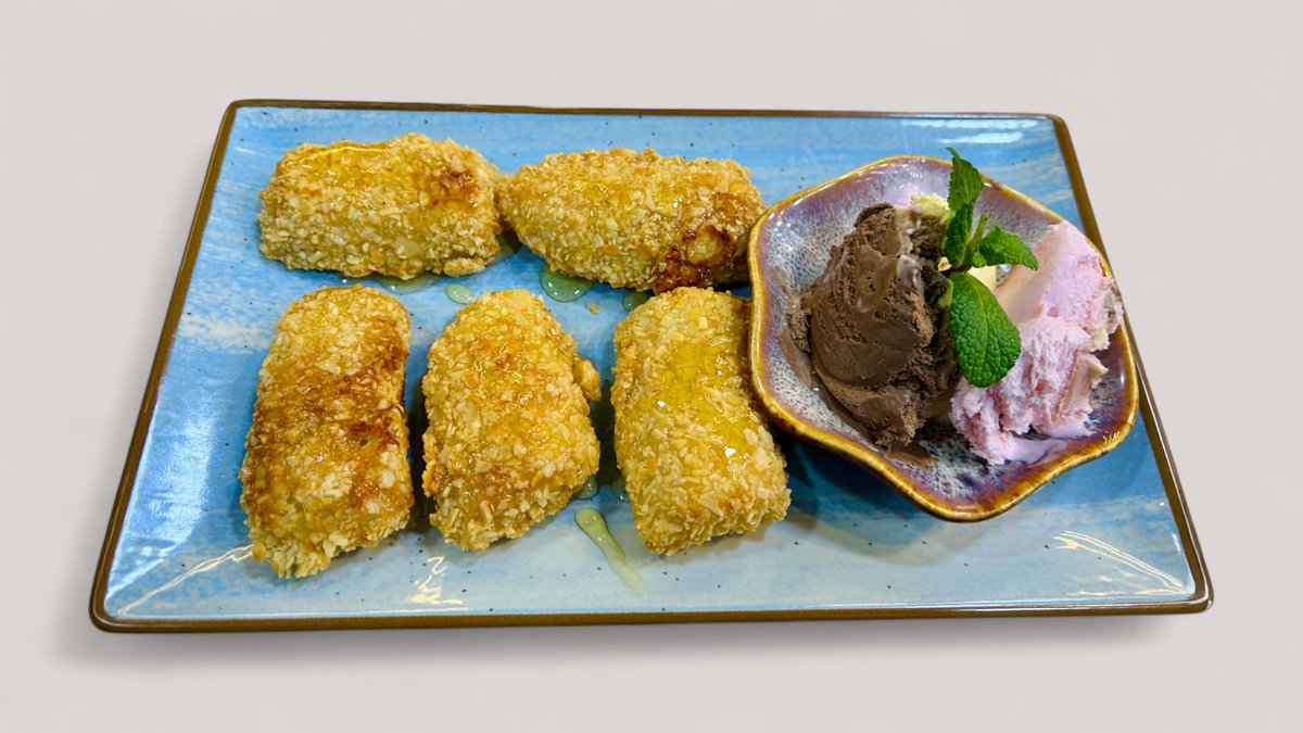 Rizs tészta, tavaszi tekercs, bétellevélbe csomagolt sertéshúst grillezni, paprika, uborka, jég saláta, koriander