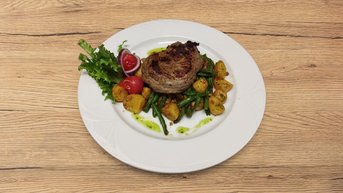 Sült császárszalonnás bélszín steak, zöldbabbal