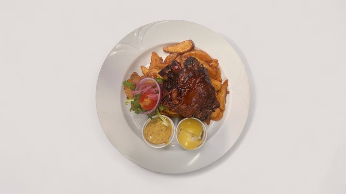 Kemencében sült sertéscsülök, fűszeres burgonyával, mustármártással, savanyúsággal