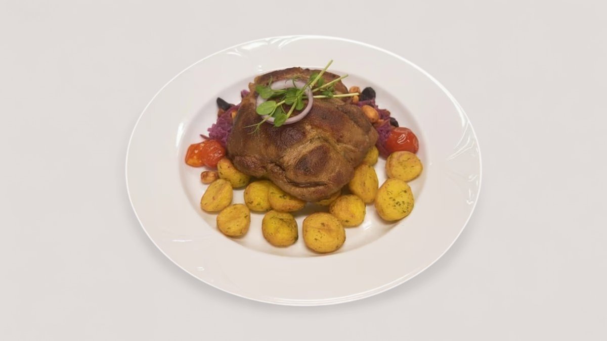 Rozmaringos, mustáros konfitált tarja petrezselymes burgonyával, zöldalmás-kapros waldorf salátával, aszalt meggyel