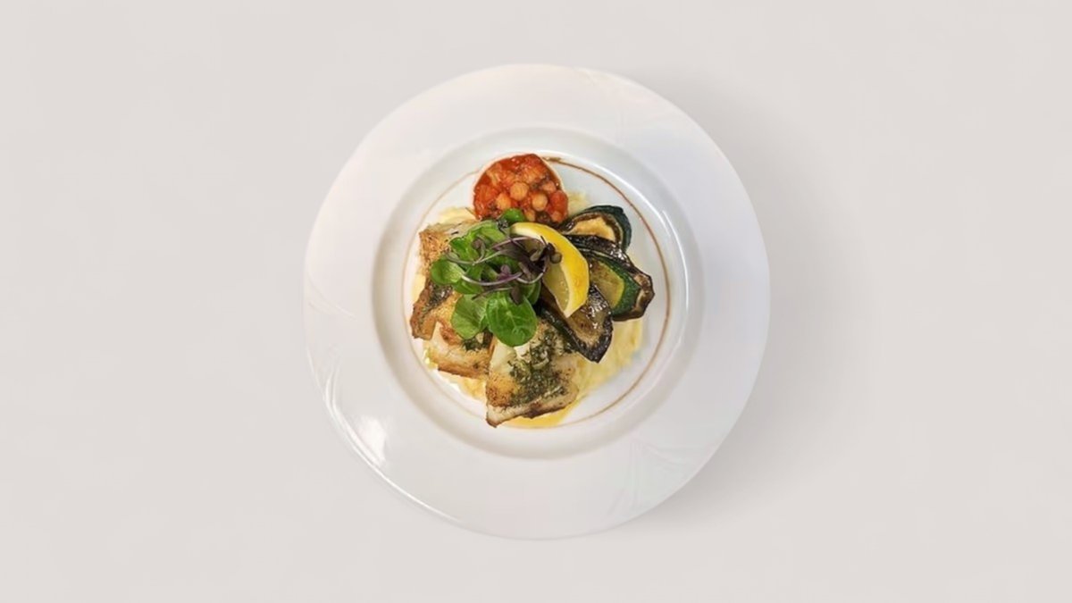 Zöldfűszeres tőkehal chorizos, paradicsomos csicseriborsó raguval