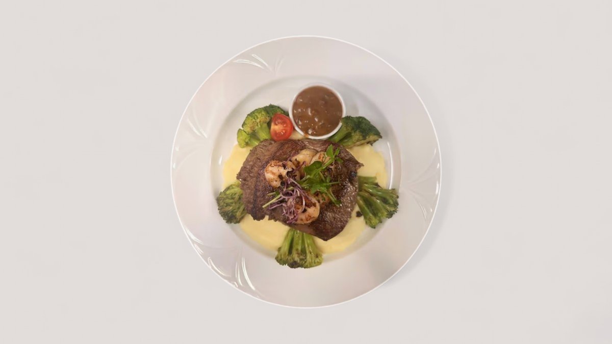 élszín steak misós-chilis vajmártással, tigrisrákfarokkal grillezett feketeszezámos brokkoli, burgonyapüré, sült koktélparadicsom