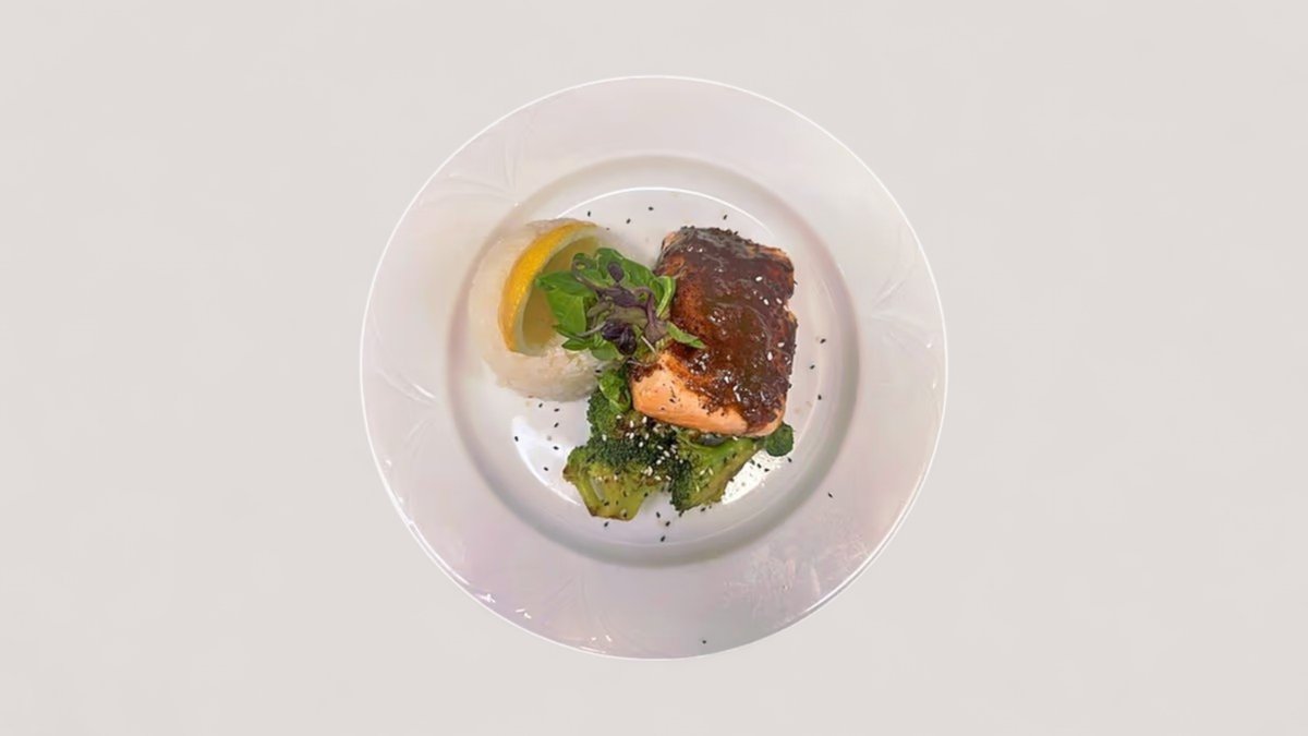 Földimogyorós szójás fűszermázban sült lazacderék, jázminrizzsel, gyömbéres brokkolival,