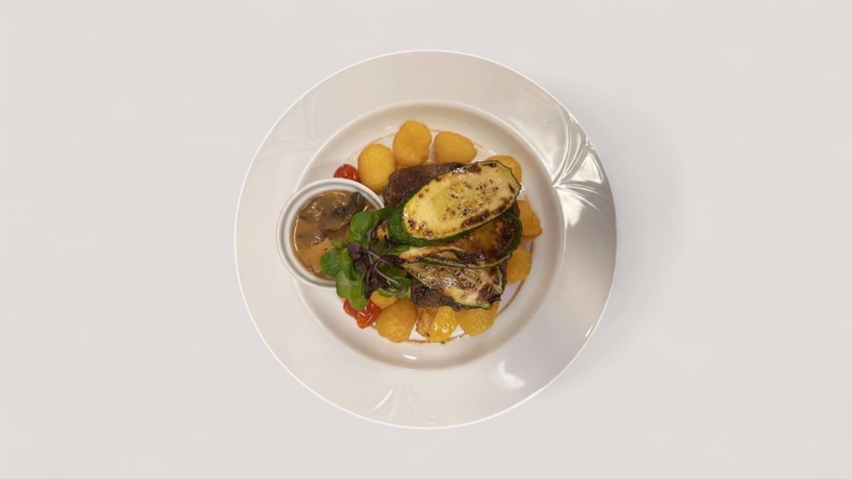 Bélszín steak zelleres erdei gomba raguva, parmezános parázsburgonyán, grillezett cukkinivel
