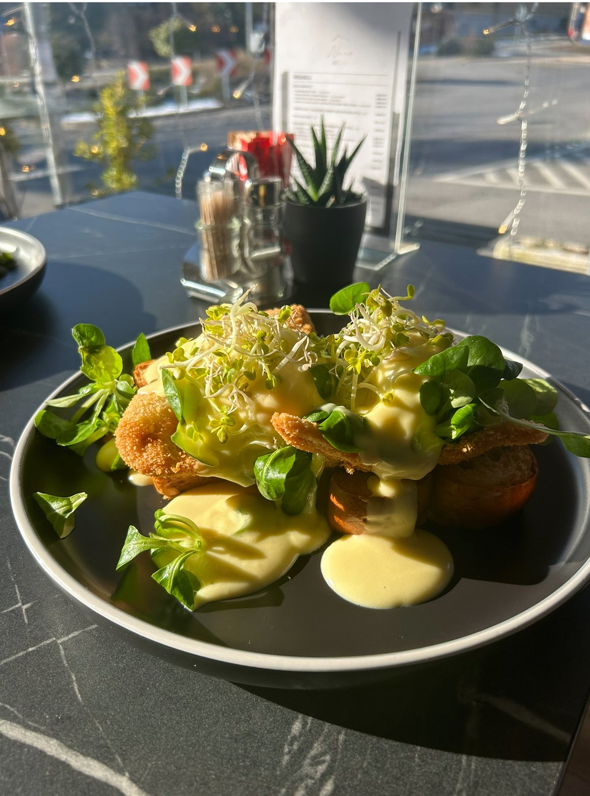 brioche, mézben pácolt sonka, buggyantott tojás, házi hollandi szósz