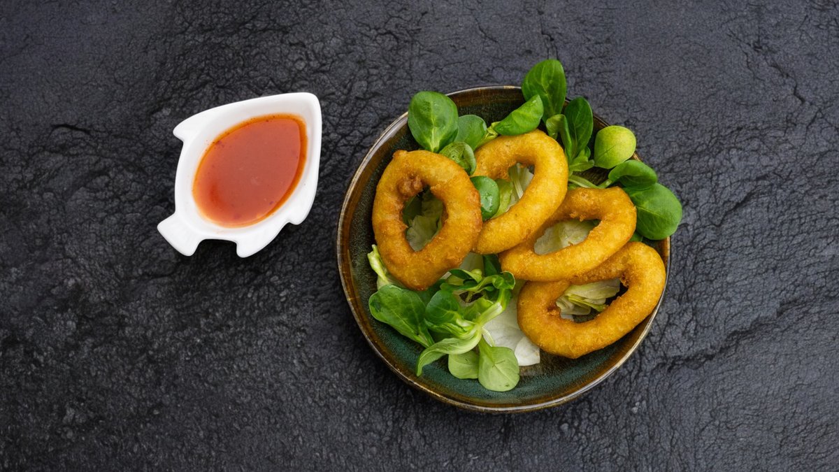 Aranybarnára sült tintahalkarikák saláta ágyon édes-chili szósszal.