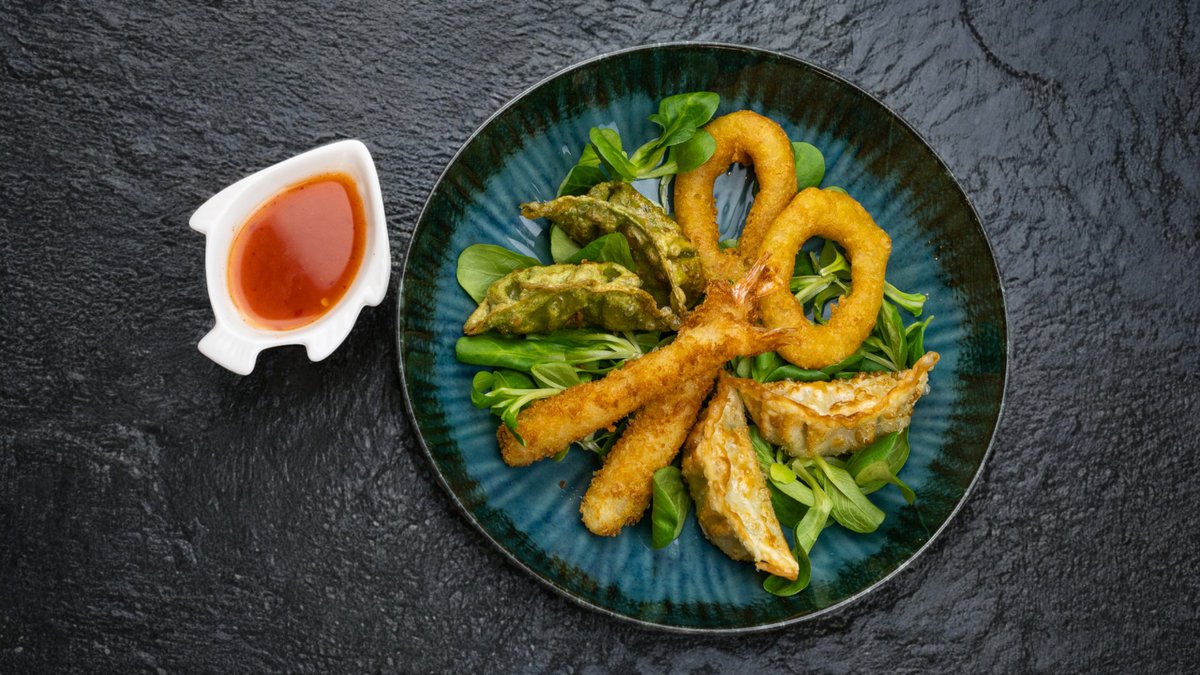 Sült ropogós rák, tintahal, vega és csirkés gyoza válogatás saláta ágyon édes-chili szósszal