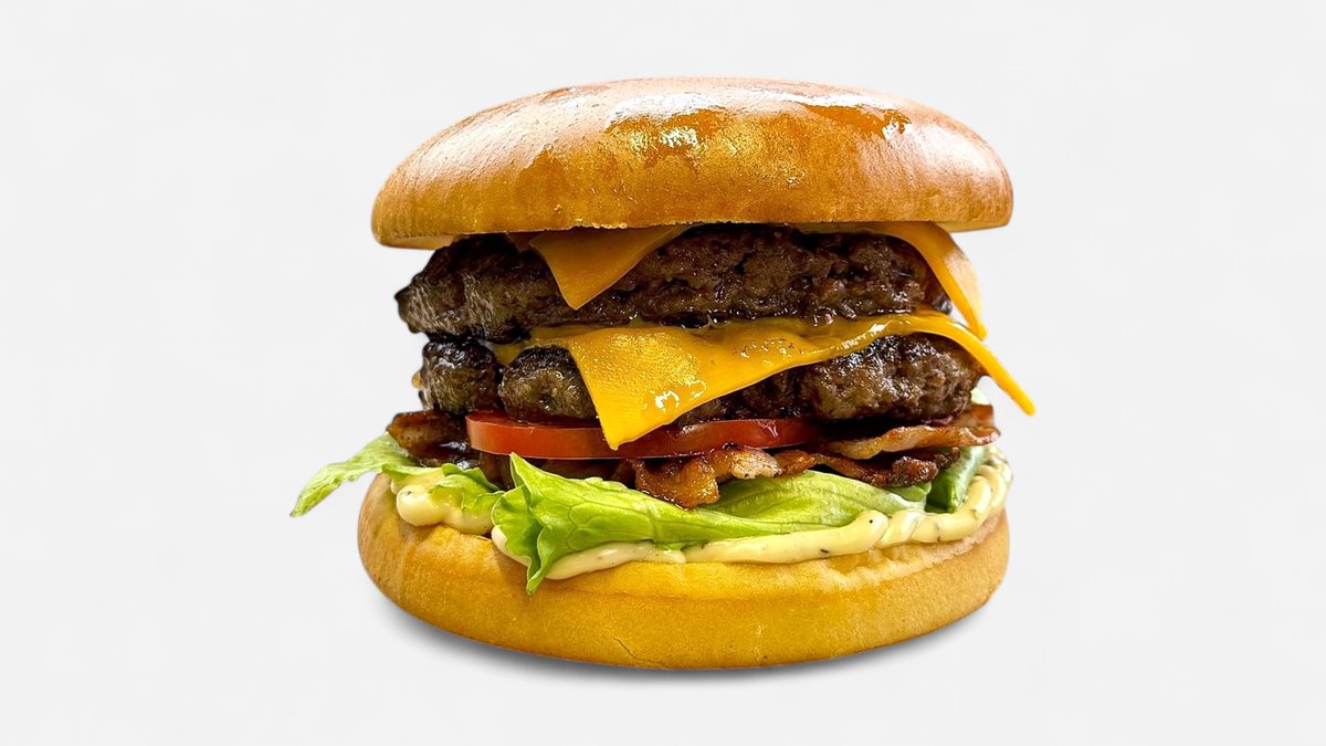 Dupla marhahúspogácsa, dupla cheddar sajt, duola bacon, jégsaláta, paradicsom, borsos majonéz