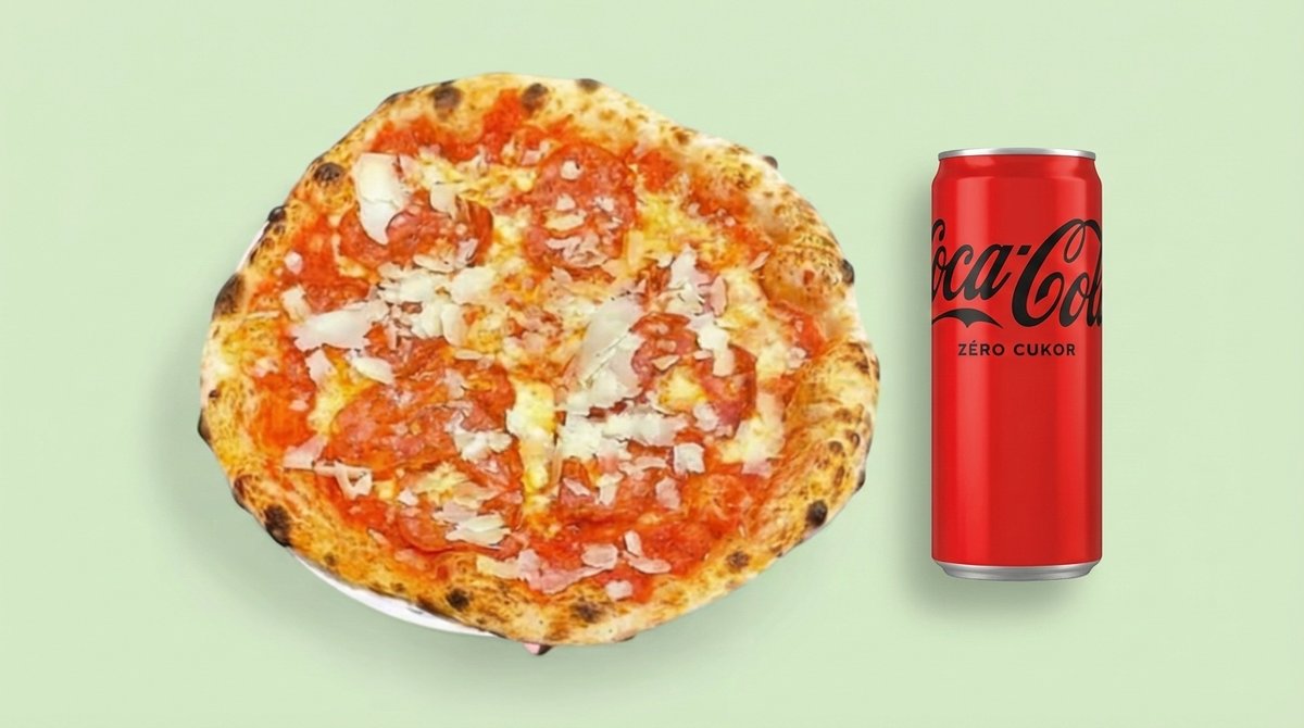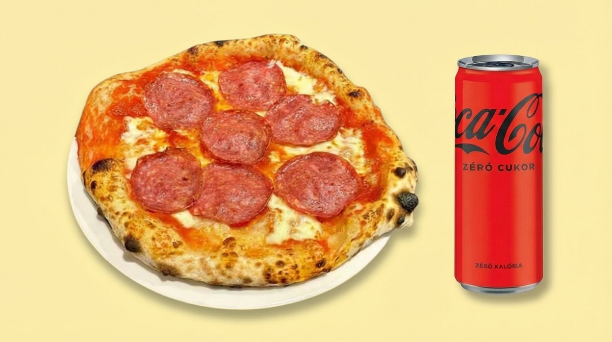 SZALÁMIS PIZZA + választható kedvezményes Coca-Cola üdítő! - PARADICSOMSZÓSZ, MOZZARELLA,OLASZ SZALÁMI, BAZSALIKOM, OLIVAOLAJ
