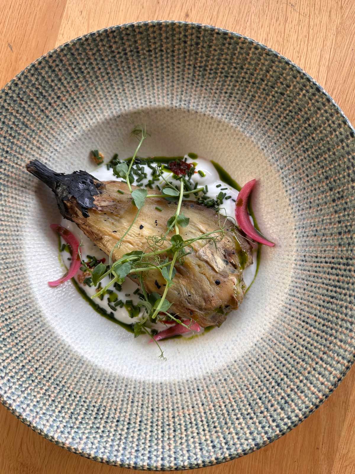 Égetett padlizsán, labneh, harissa