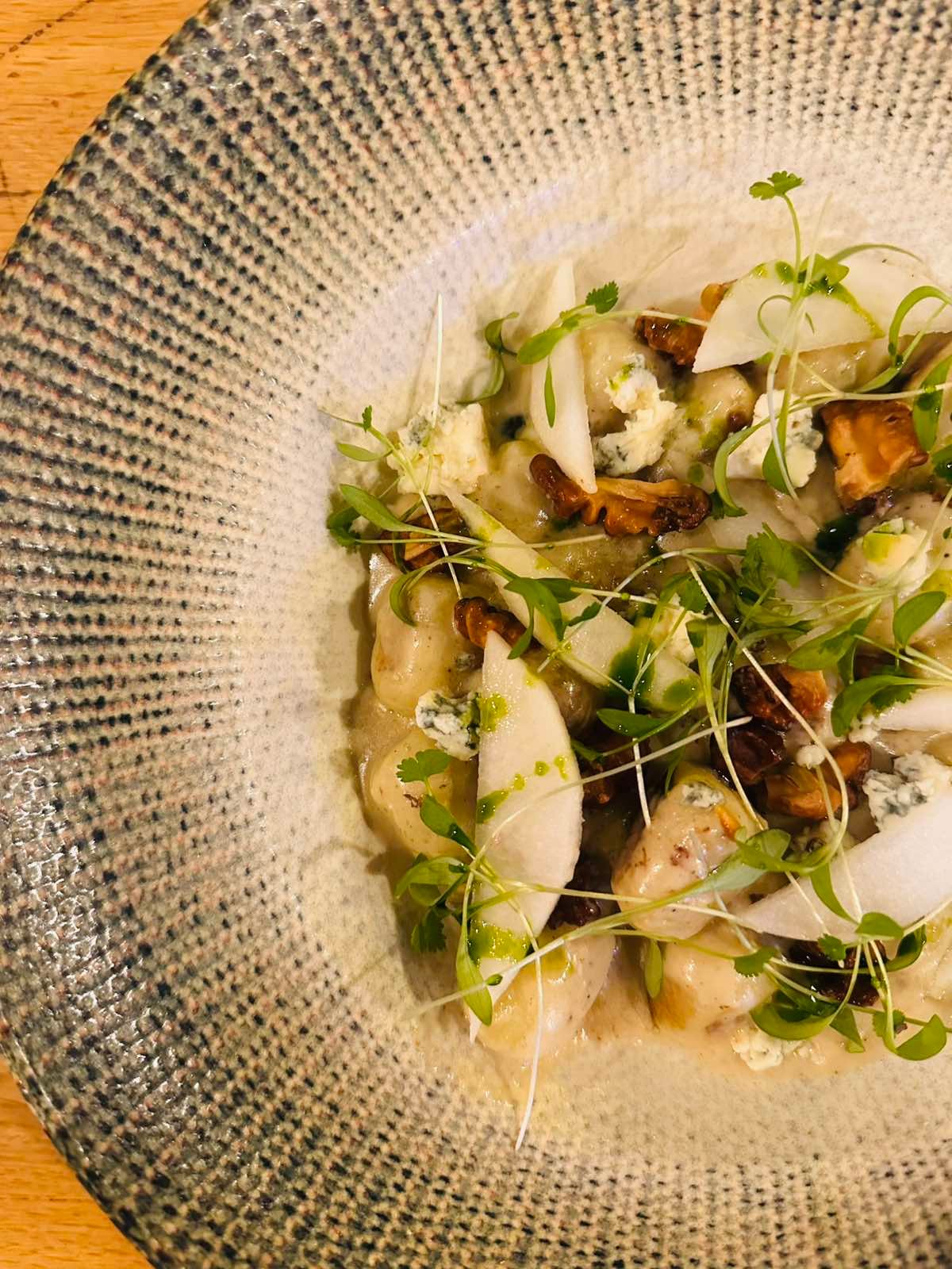 Kéksajtos gnocchi, körte, dió