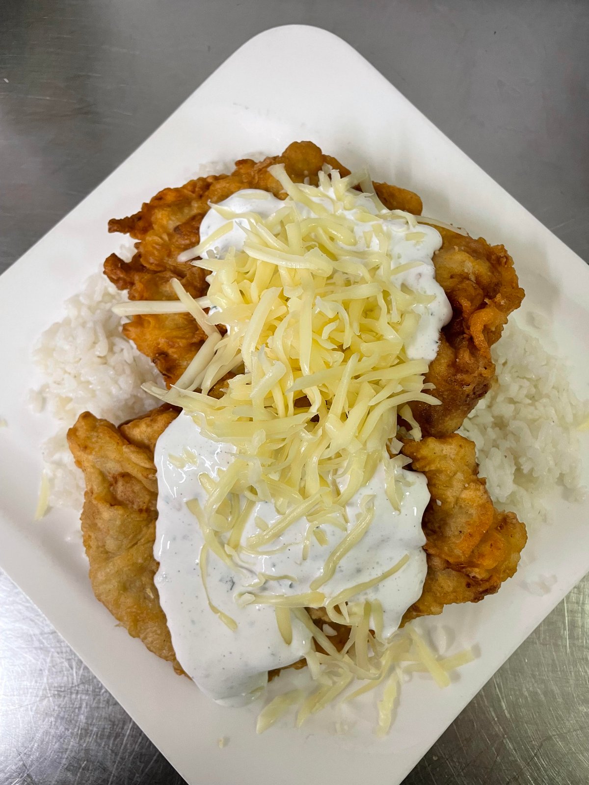HUF 4,790Paradicsomleves rizzsel (0,5l), 1 db rántott sajt és 1 szelet rántott csirkemellfilé sültburgonyával, tartárral ;