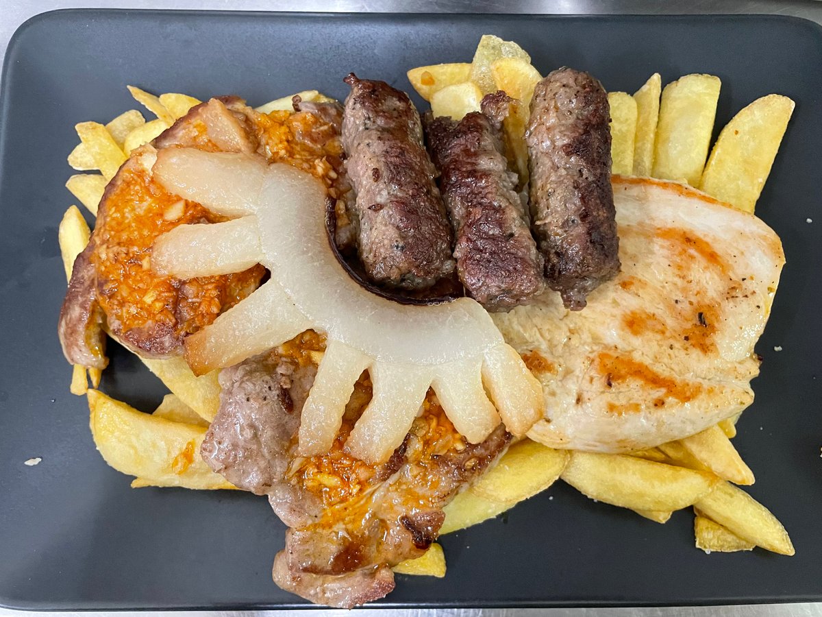 Erőleves tésztával, Brassói hasábburgonyával, Káposzta saláta, 2 db vegyes gyümölcs lekváros palacsinta ;
