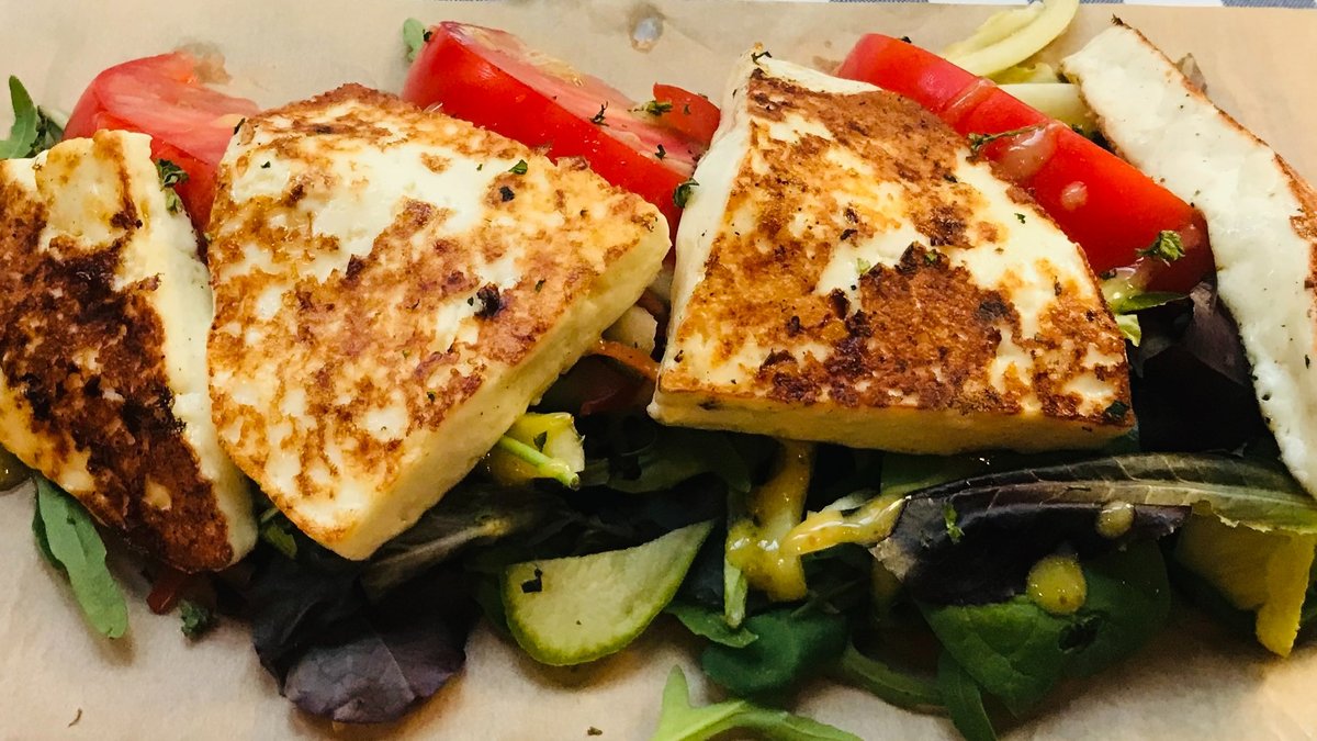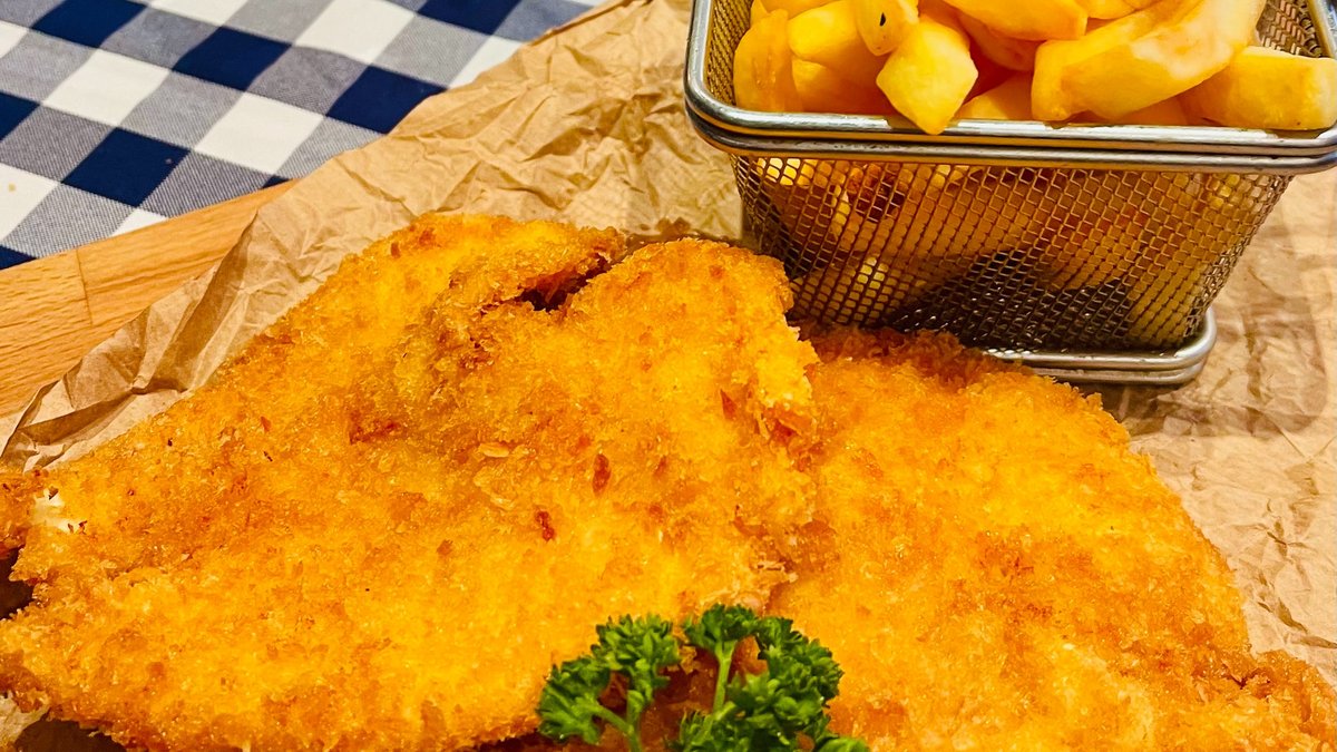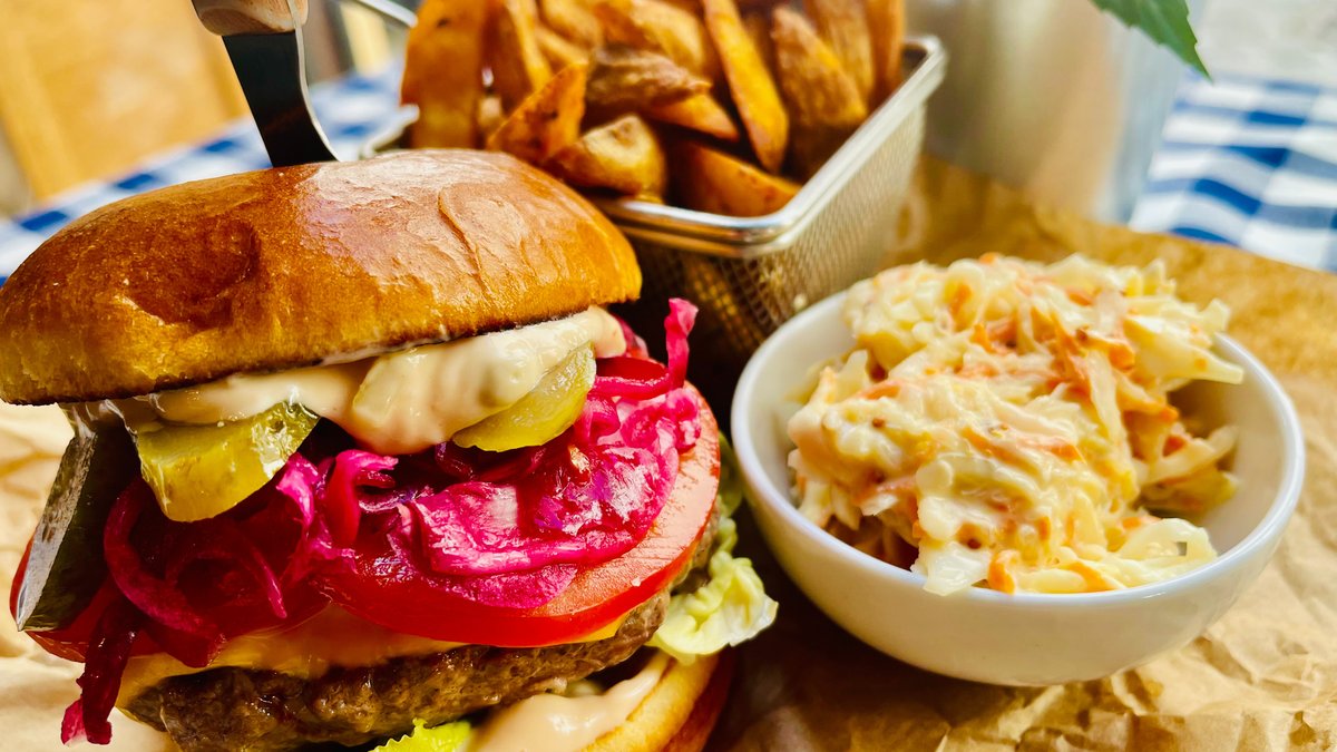 Sajtos hamburger hasábburgonyával és házi coleslaw salátával