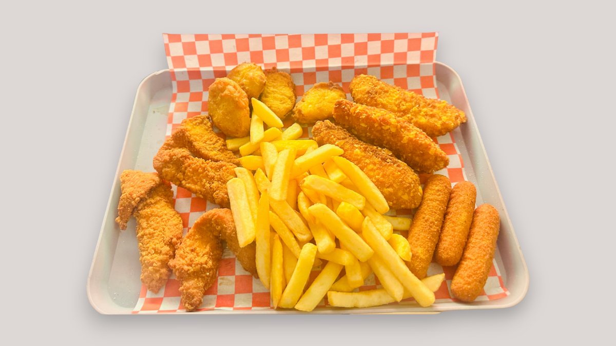 French fries, mozza sticks, chili cheese nuggets, cheese wedges, chicken nuggets, onion rings
