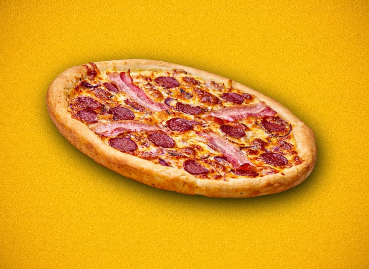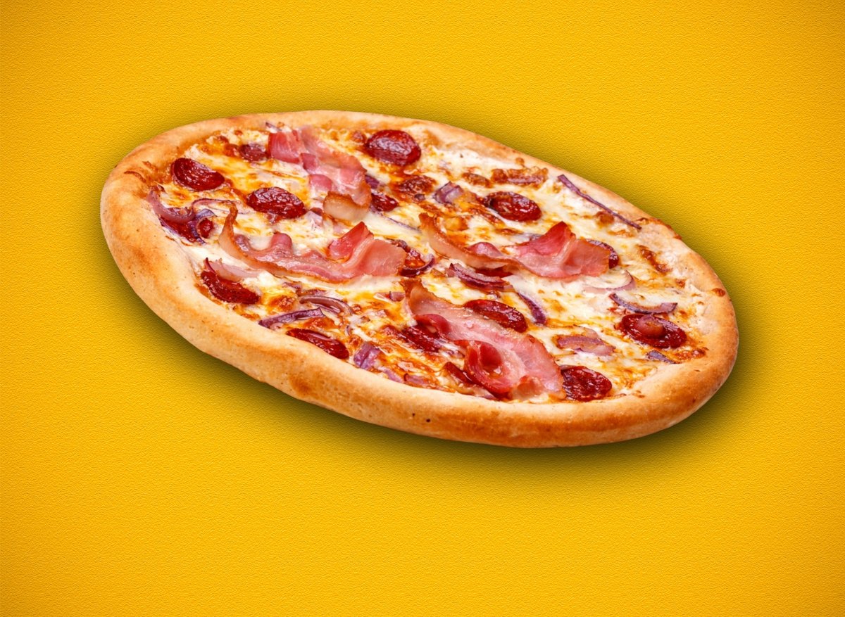 paradicsomos alap, lilahagyma, bacon, hegyes erős paprika, kolbász, fior di latte mozzarella sajt