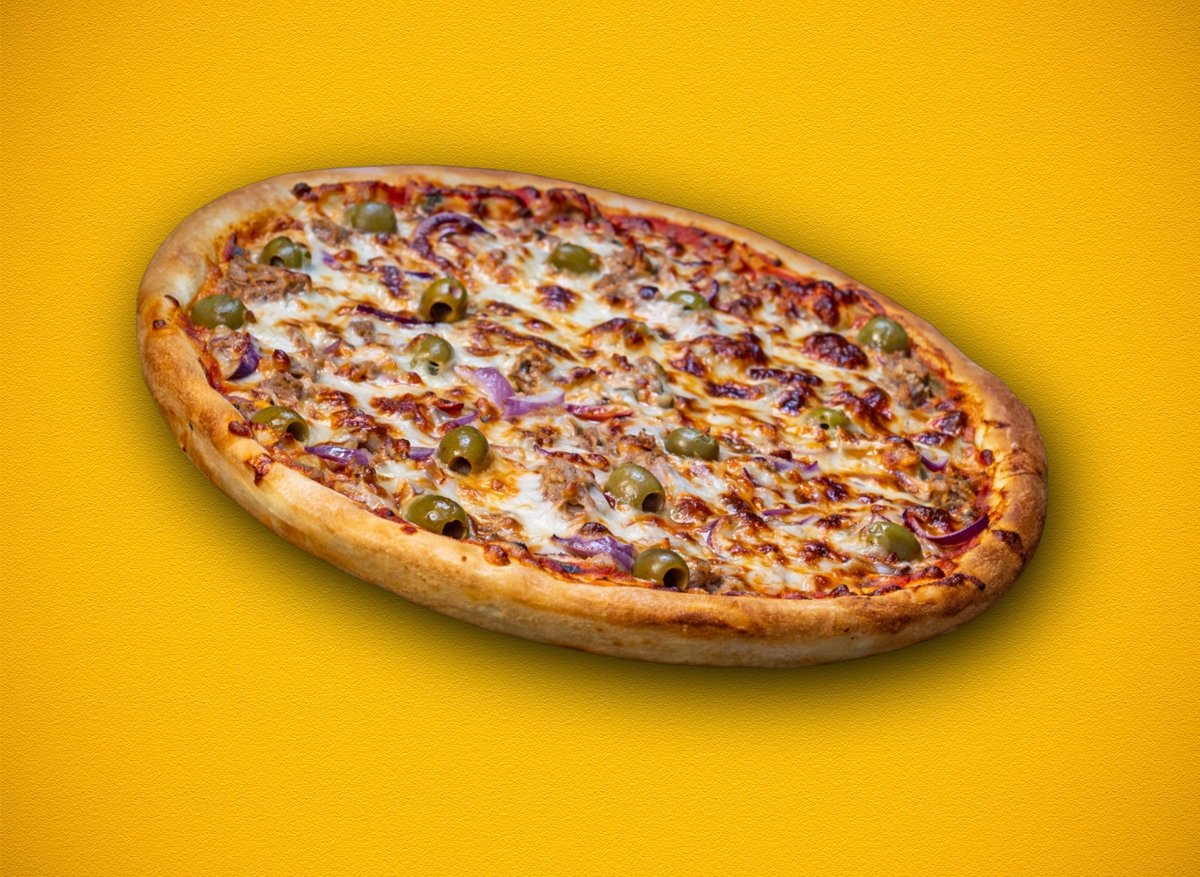 paradicsomos alap, tonhal, lilahagyma, fekete olívabogyó, fior di latte mozzarella sajt
