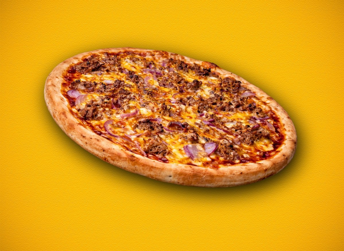 paradicsomos alap, pulled pork hús, BBQ, lilahagyma, fior di latte mozzarella - cheddar sajt