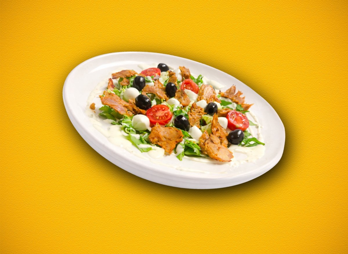Majd nem egy igazi gyros tál, csak annyiban különbözik, hogy ezt mi egy igazi saláta válogatással helyettesítjük és megbolondítva mozzarella golyókkal és fekete olivabogyóval.