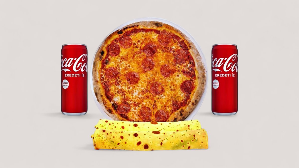 Pepperoni Pizza 32 cm 1 db Nutellás Palacsinta (Valódi Nutellával) 1 db Baracklekváros Palacsinta 2 db Coca Cola 0,33l
