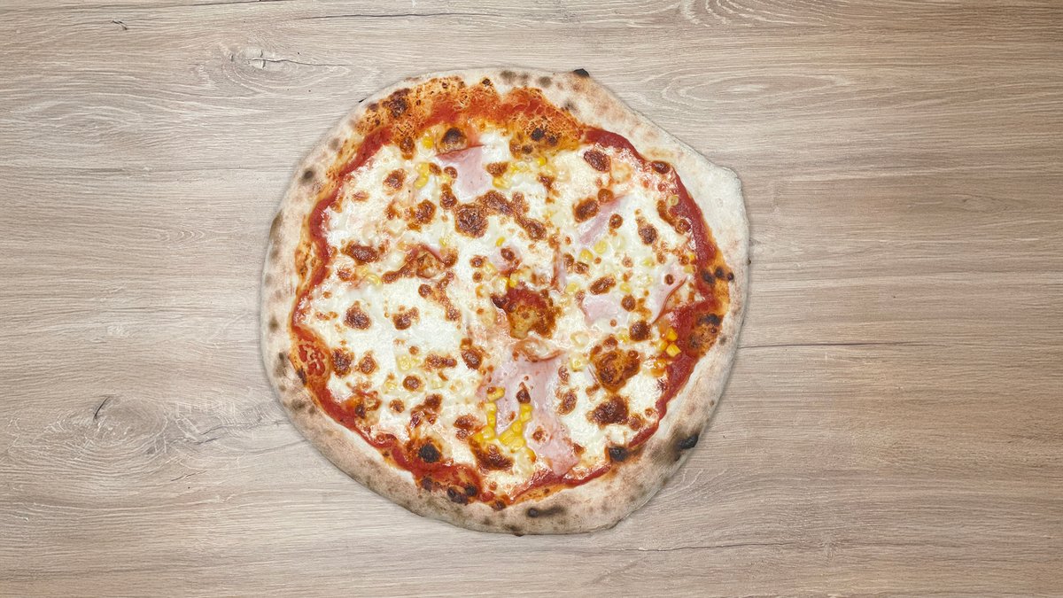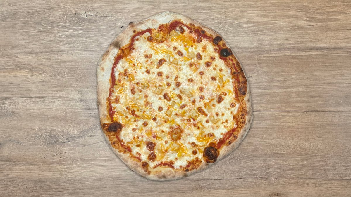 paradicsomszósz, sonka, ananász, kukorica, mozzarella sajt