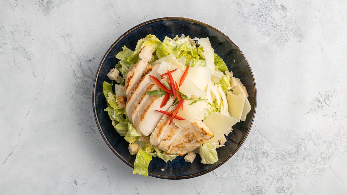 Római saláta, cézár dresszing, pirított kenyér, parmezán sajt, Grill csirkemell