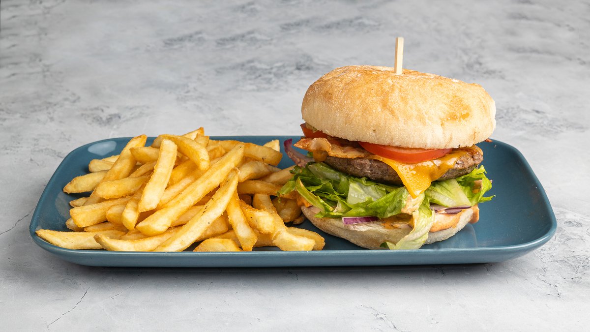 Marhahúspogácsa, bőséges olvadó cheddar sajt, ementáli sajt, csemegeuborka, római saláta, paradicsom, lilahagyma és klasszikus amerikai burgerszósz. Beef patty, cheddar cheese, emmentaler cheese, pickles, iceberg lettuce, tomato, red onions and classic American burger sauce.