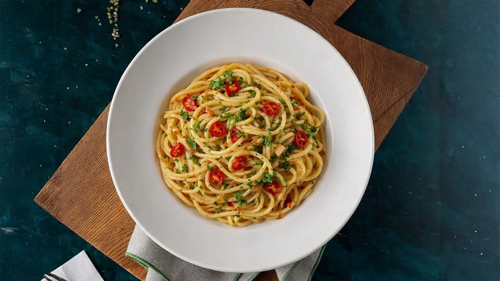 Spagetti tészta extra szűz olívaolajban pirított chilivel, fokhagymával és friss petrezselyemmel. Spaghetti pasta sautéed in extra virgin olive oil with chili, garlic and fresh parsley.