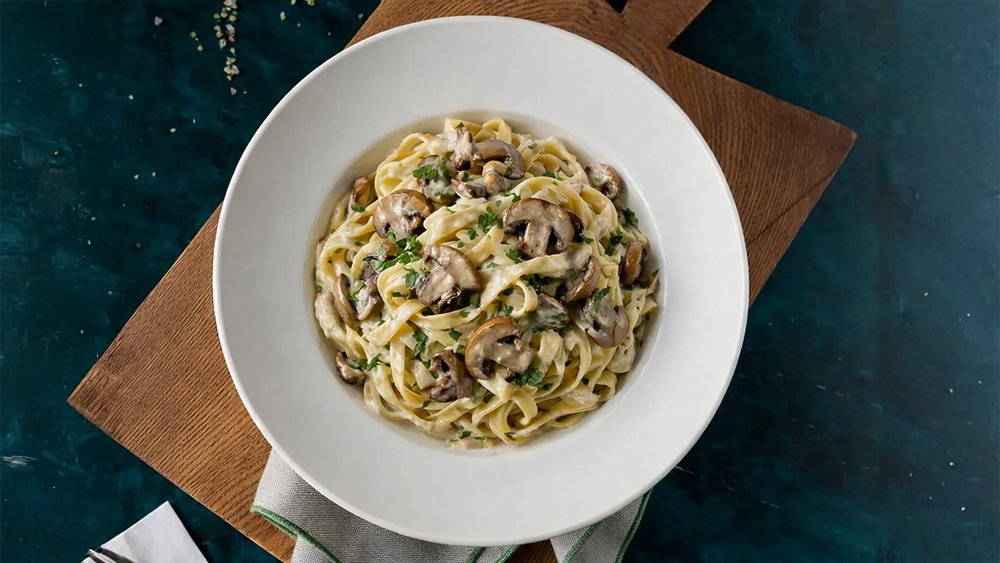 Tagliatelle tészta krémes tejszínmártással és pirított gombavariációkkal. Tagliatelle pasta with creamy sauce and sautéed mushroom variations.