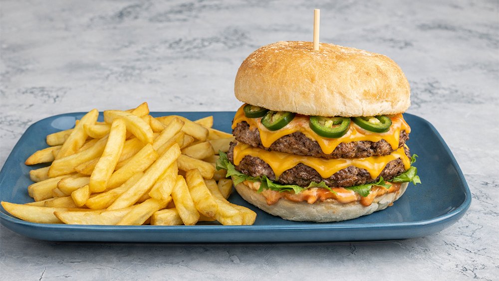 Dupla smash marhahúspogácsa, olvadó cheddar, csípős jalapeño paprika karikák, chili-majonéz és római saláta. Double smash beef patty, double cheddar cheese, chili jalapeño pepper rings, chili mayonnaise and iceberg lettuce.