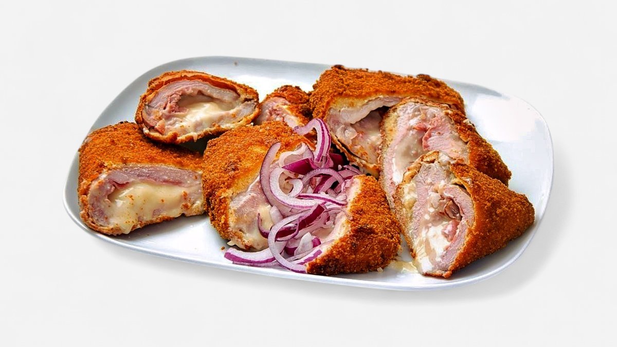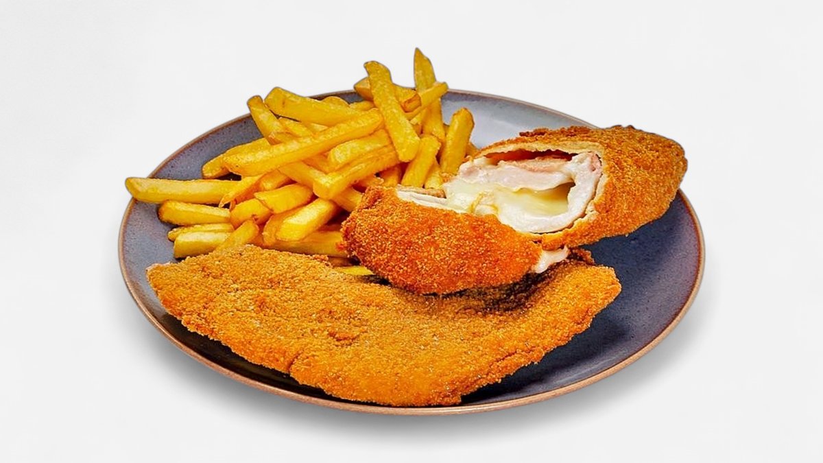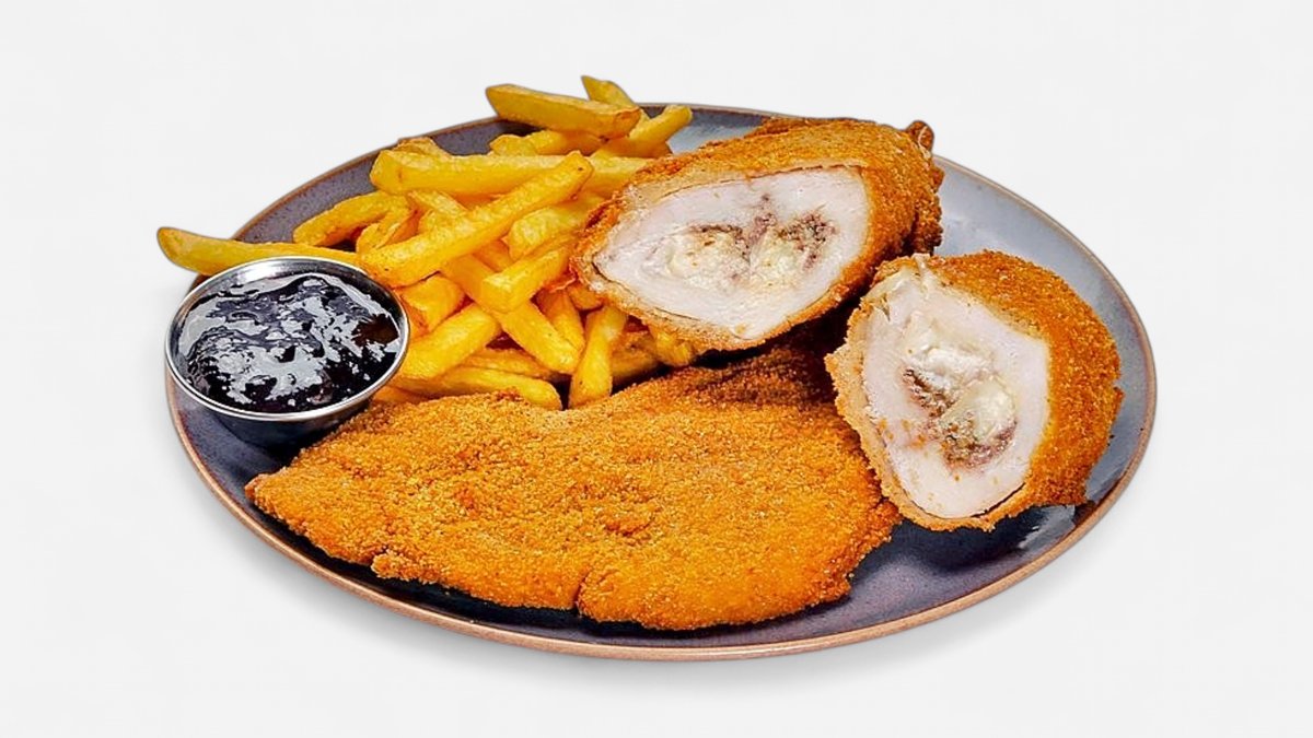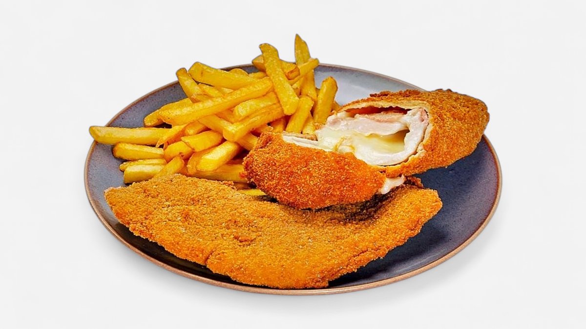 Ropogósra sütött Cordon Bleu, amelyet sonkával és sajttal töltöttünk meg, egy tányéron tálalva a klasszikus rántott csirkemellel. (Allegén: Glutén, Tojás, Tej)