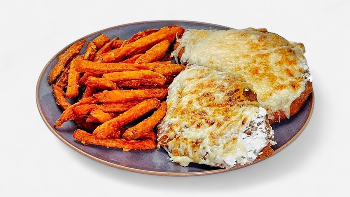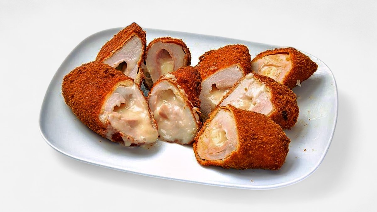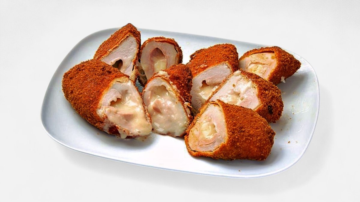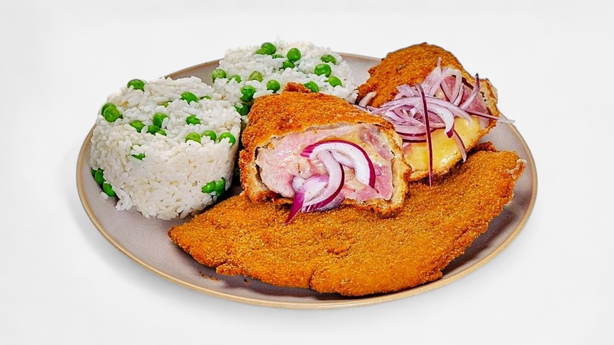 Ropogósra sütött Cordon Bleu, amelyet sonkával és sajttal töltöttünk meg, egy tányéron tálalva a klasszikus rántott csirkemellel. (Allegén: Glutén, Tojás, Tej)