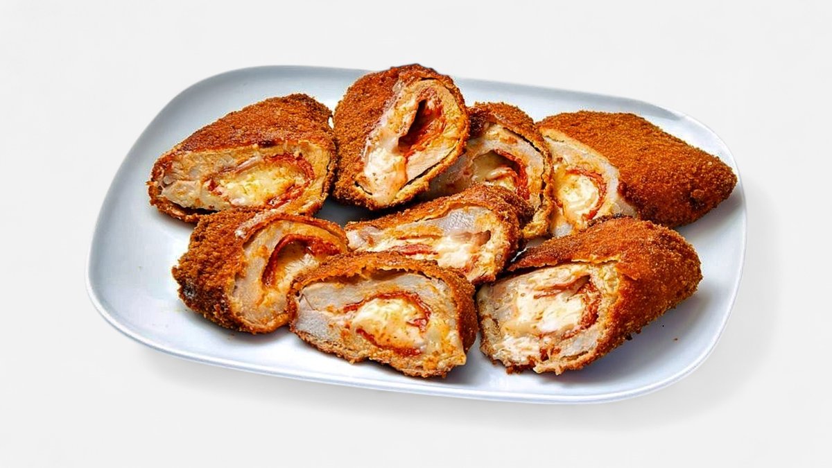 Különleges rántott töltött sertés szűz, amely füstölt tarjával, füstölt sajttal és pepperoni paprikával van töltve, kombinálva ropogósra sült rántott karaj szelettel. (Allegén: Glutén, Tojás, Tej)