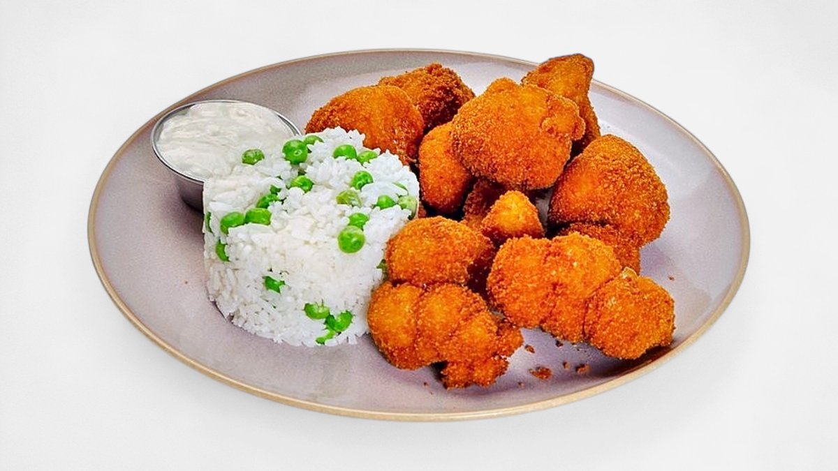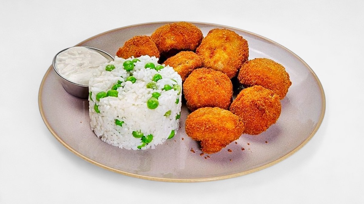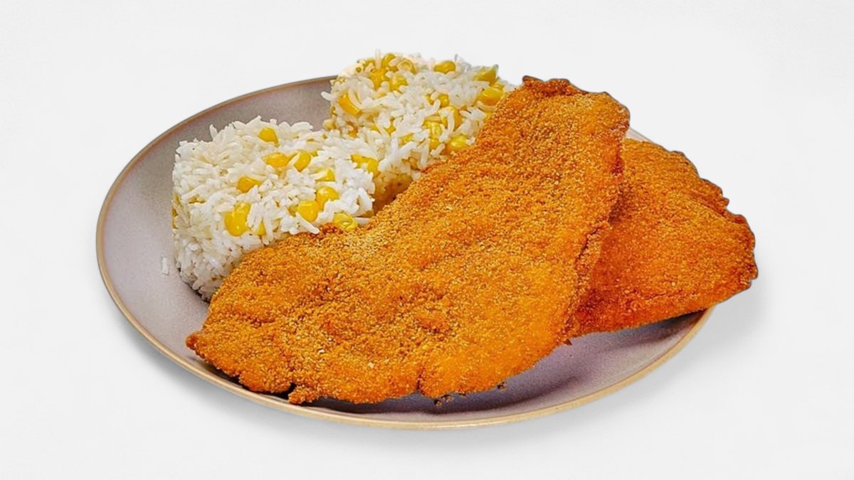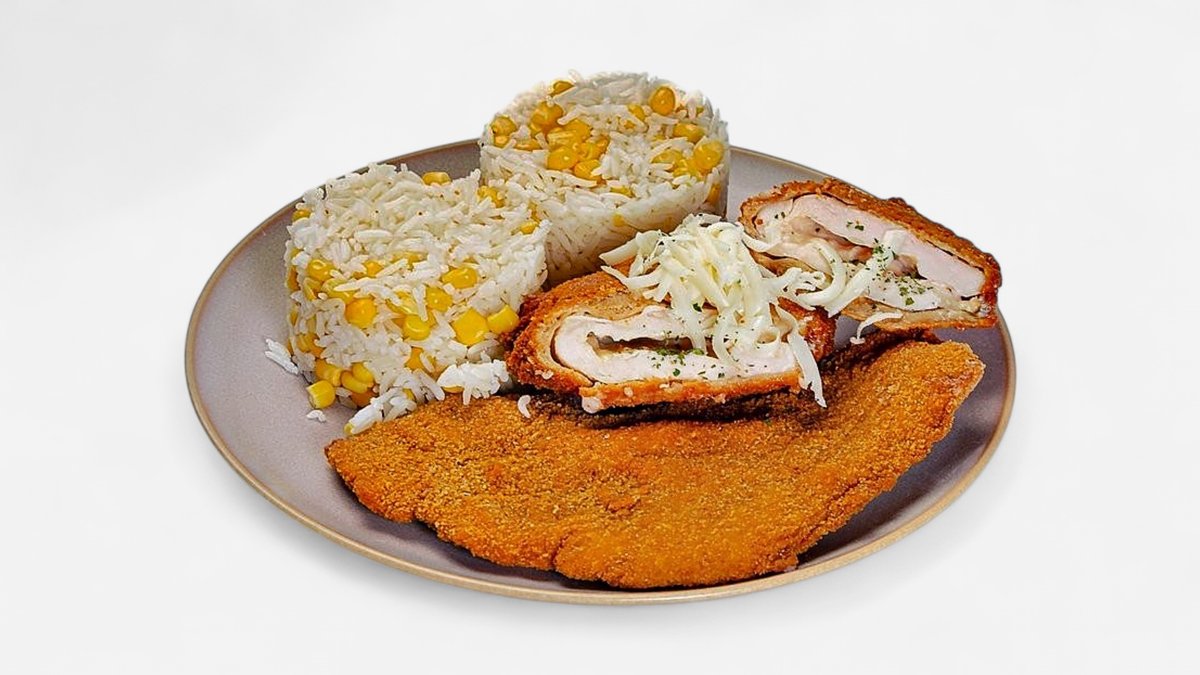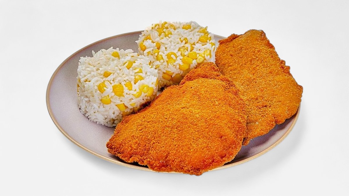 1db 10dkg-os rántott csirkemellszelet, 1db 10dkg-os rántott karajszelet, 2db 10dkg-os rántott sajtszelet, 0,5kg jázminrizs