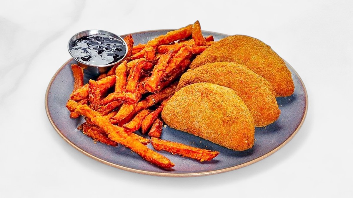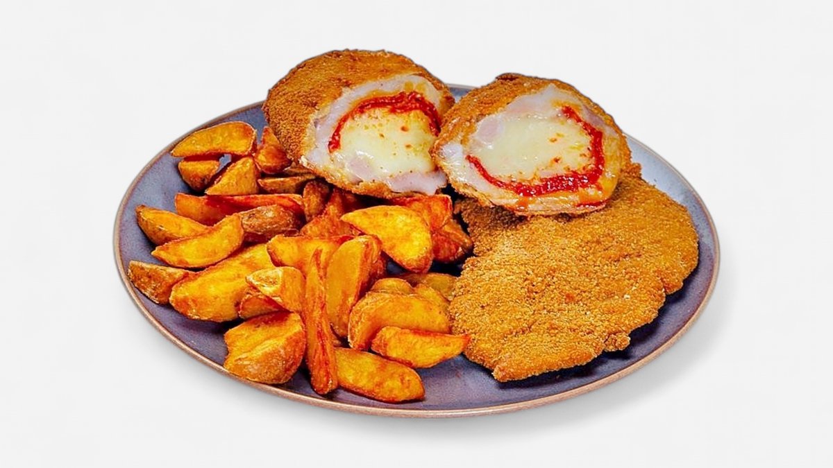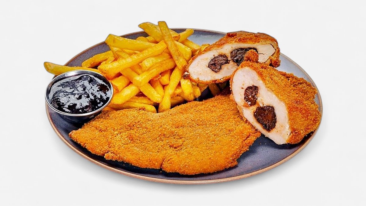 Ínycsiklandó kijevi csirkemell, amelyet ízletes fűszervajjal töltünk meg, és sajttal megszórva tálalunk, valamint egy ízletes rántott csirkemellel egészítjük ki. (Allegén: Glutén, Tojás, Tej)