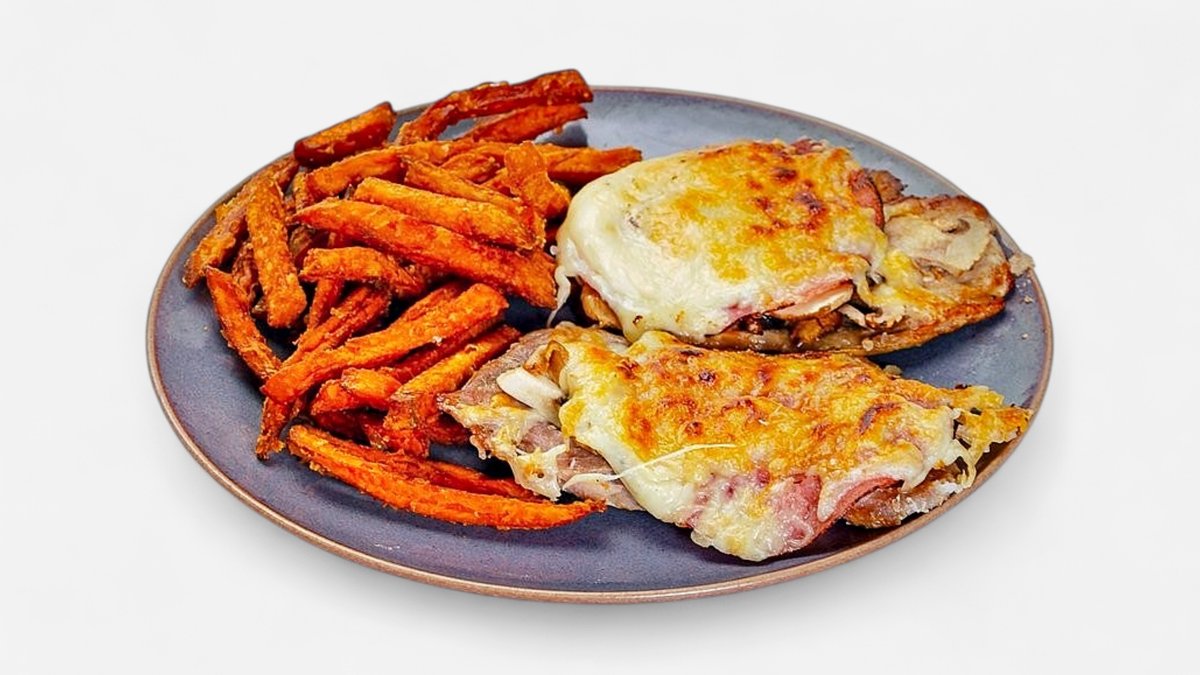 Sonkával, gombával és sajttal gazdagon megrakott grillezett karaj, amelyet kemencében sütünk tökéletesre. (Allegén: Tej)