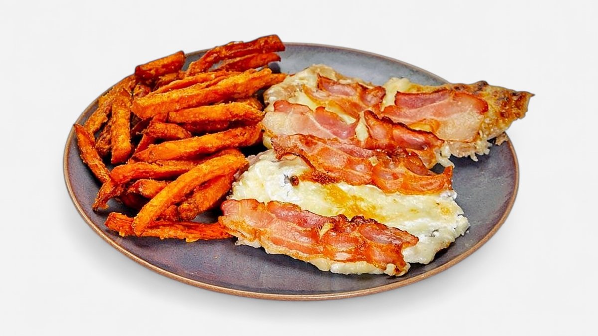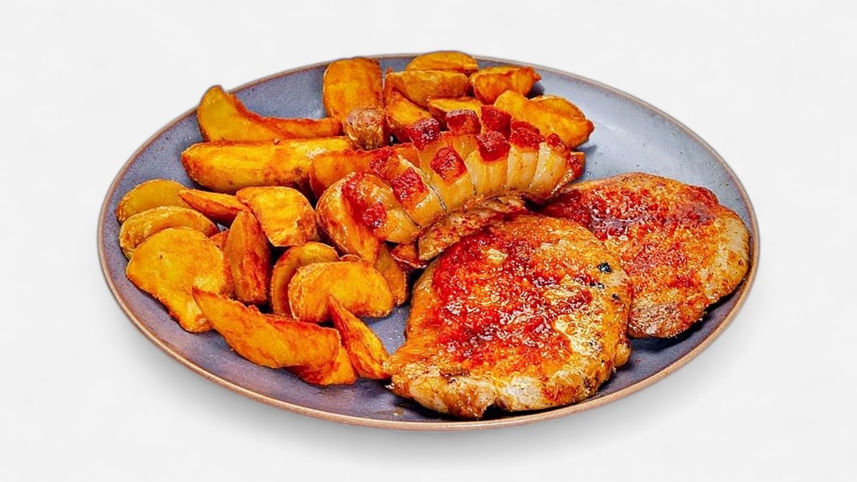 Roston Karaj fokhagymás-paprikás pácban, ropogósra sütve, és füstölt szalonnával tálalva