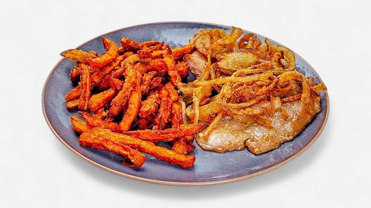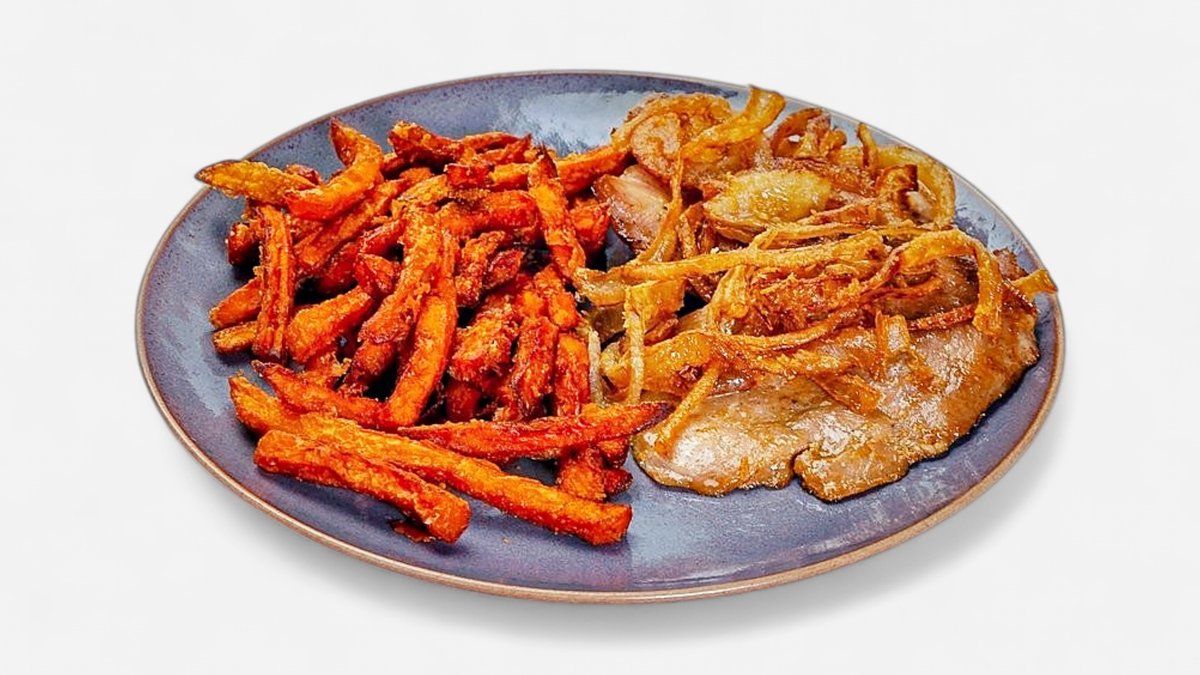 Fokhagymával ízesített, roston sült karaj, amelyet gazdagon megpakolunk sült hagymával.