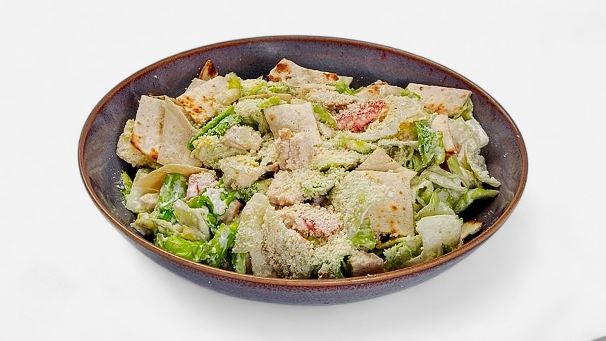 jégsaláta, paradicsom, cézár öntet, 2db 10dkg-os roston csirkemellszelet (Kérlek, válassz hozzá szószt!)