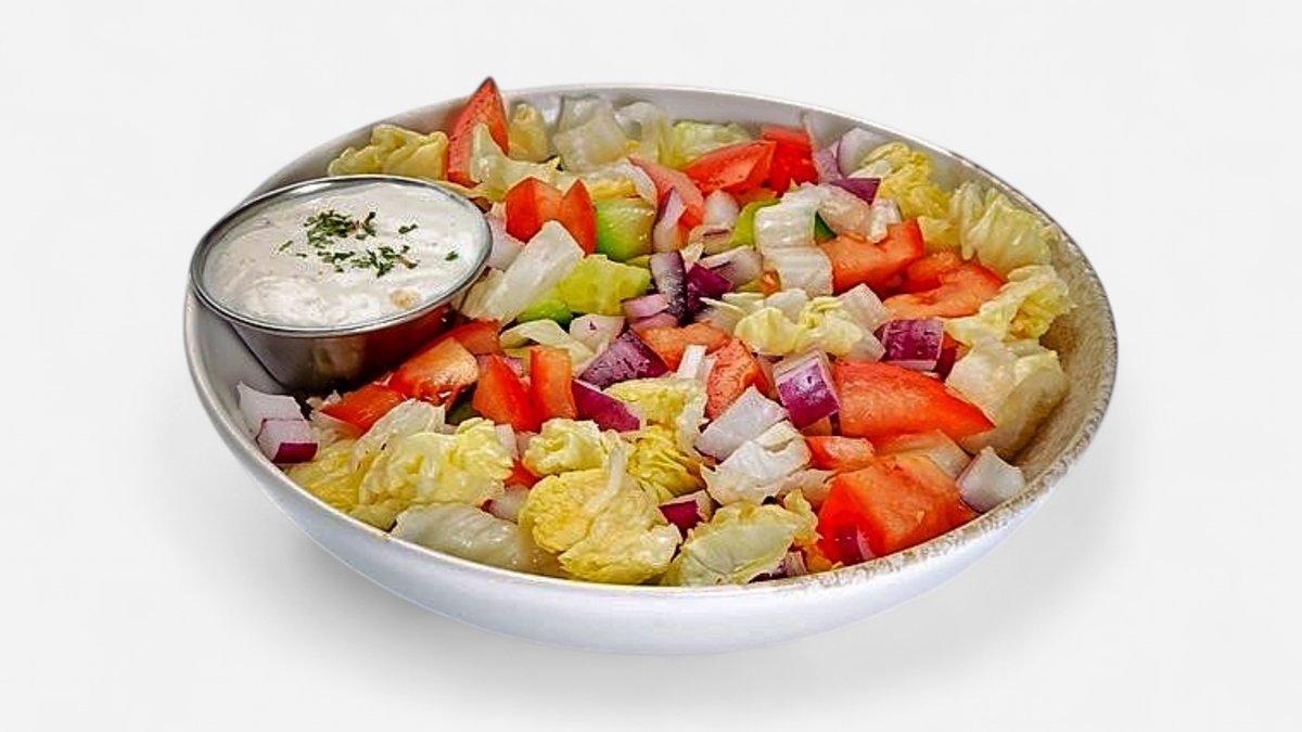 jégsaláta, uborka, paradicsom, lila hagyma (Kérlek, válassz hozzá öntetet!)