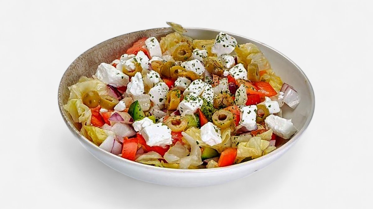 jégsaláta, uborka, paradicsom, lila hagyma, olívabogyó, olívaolaj