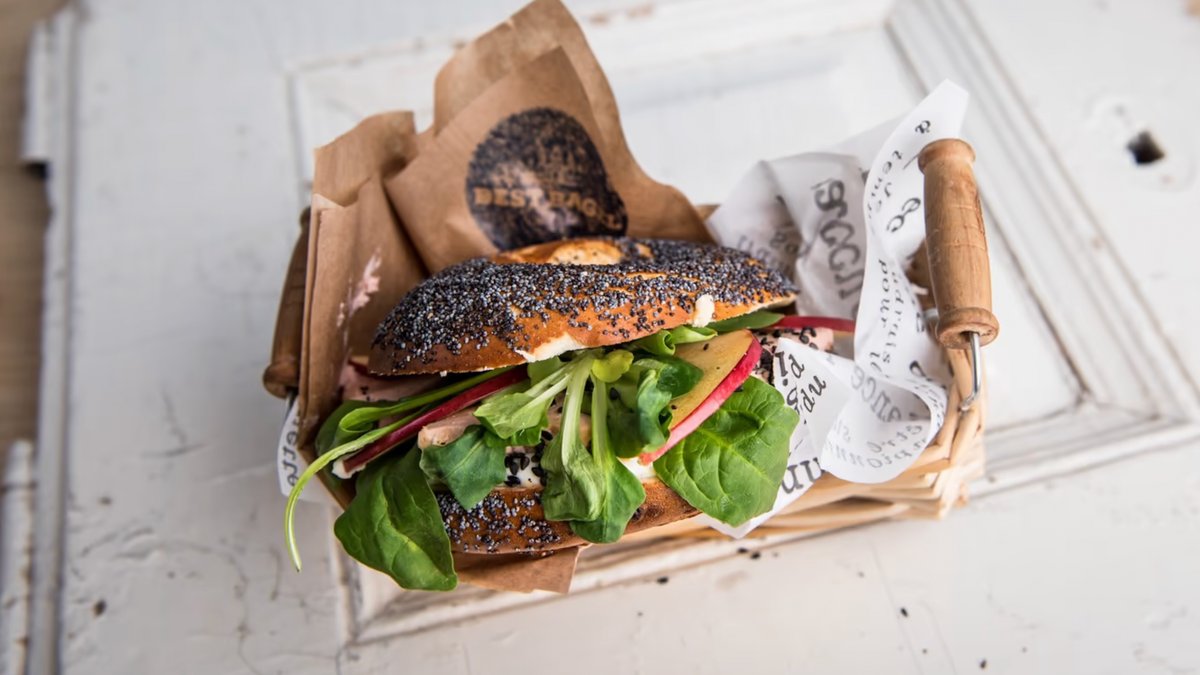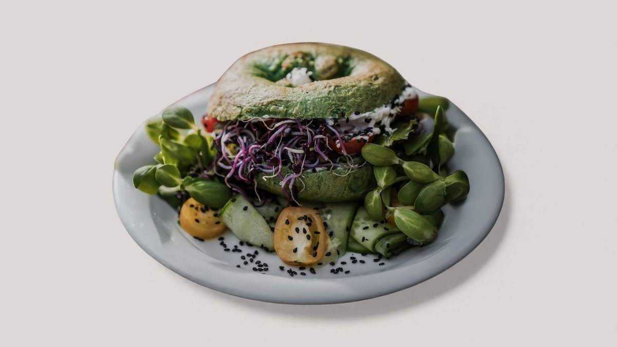 füstölt lazac, sajtkrém, zöldsaláta, vegán, tartósítószer és színezék mentes zöld matcha bagel