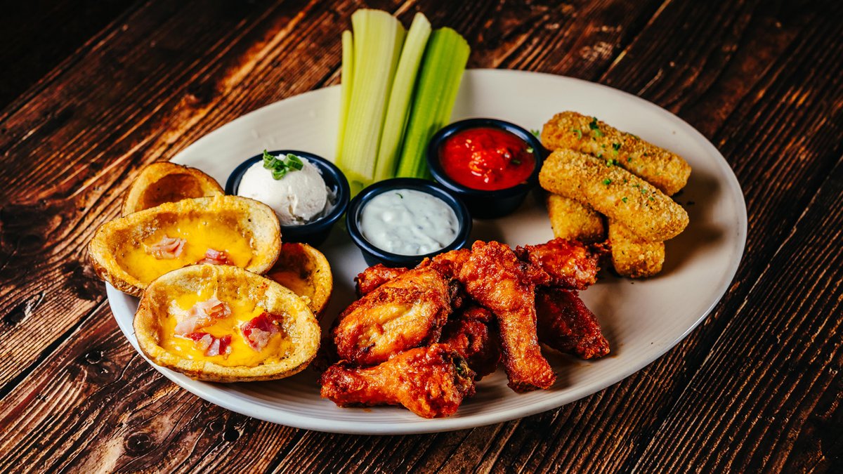 Három legkedveltebb előételünk egy tálon: cheddar sajttal és pirított bacondarabkákkal töltött ropogós burgonyacsónakok, különleges olasz fűszerezésű rántott mozzarella rudak és csípős csirkeszárnyak. Tejföllel, marinara szósszal, Blue Cheese mártással és zellerszárral tálalva. Több főre ajánljuk.