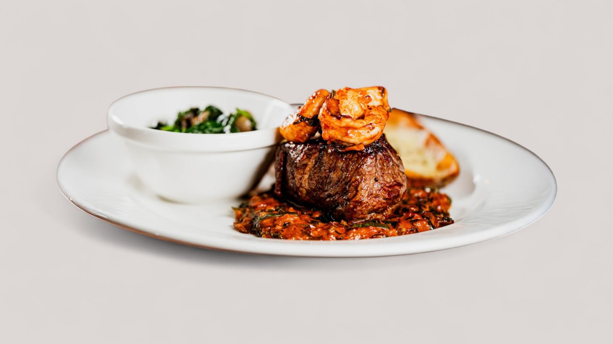 Filet Mignon és grillezett rákok protobello gombás marinara szószban, gombás spenóttal és sajttal töltött burgonyacsóna- kokkal