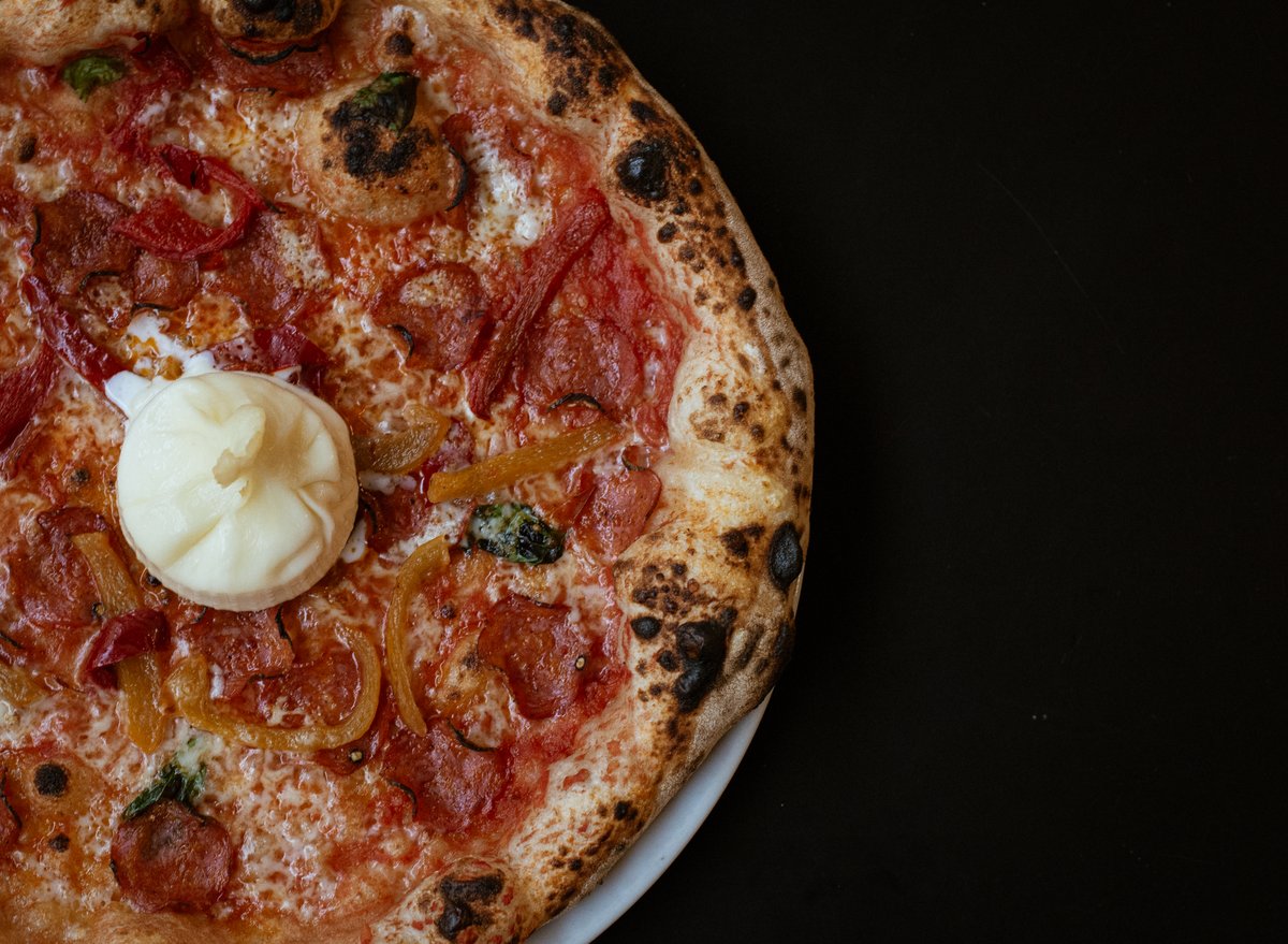 Paradicsomszósz, provolone sajt, grillezett kaliforniai paprika, nápolyi kolbász, füstölt burrata