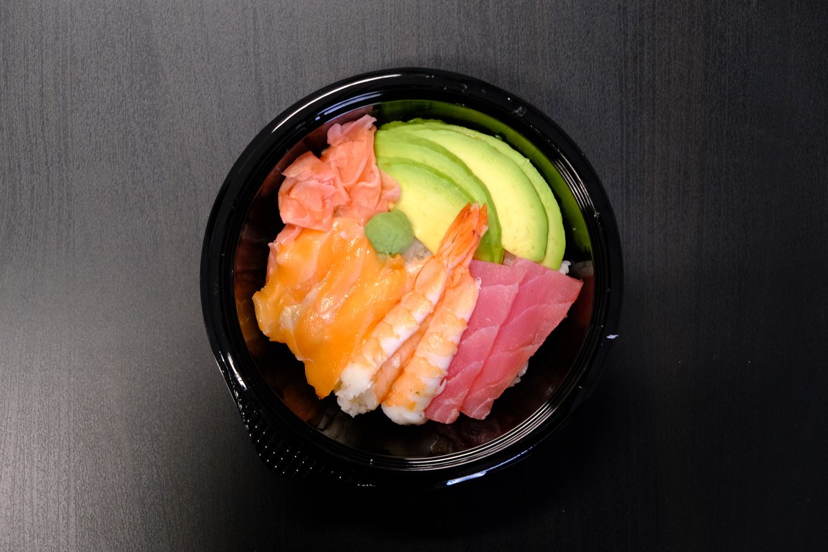 2 db lazac nigiri, 2 db tonhal nigiri, 1 db surimi nigiri, 1 db japán sárga retek, 2 db avokádó nigiri