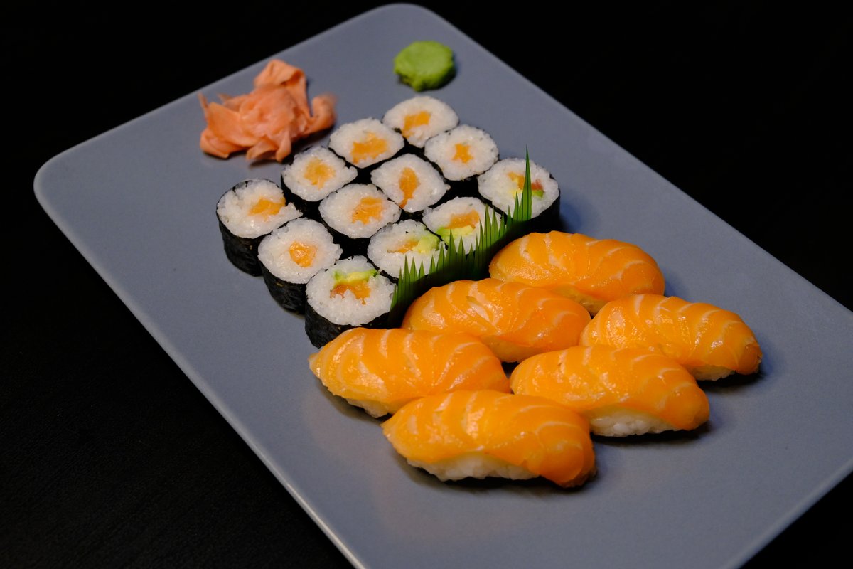 2 db lazac nigiri, 2 db tonhal nigiri, 8 db lazac maki, 8 db vega uramaki