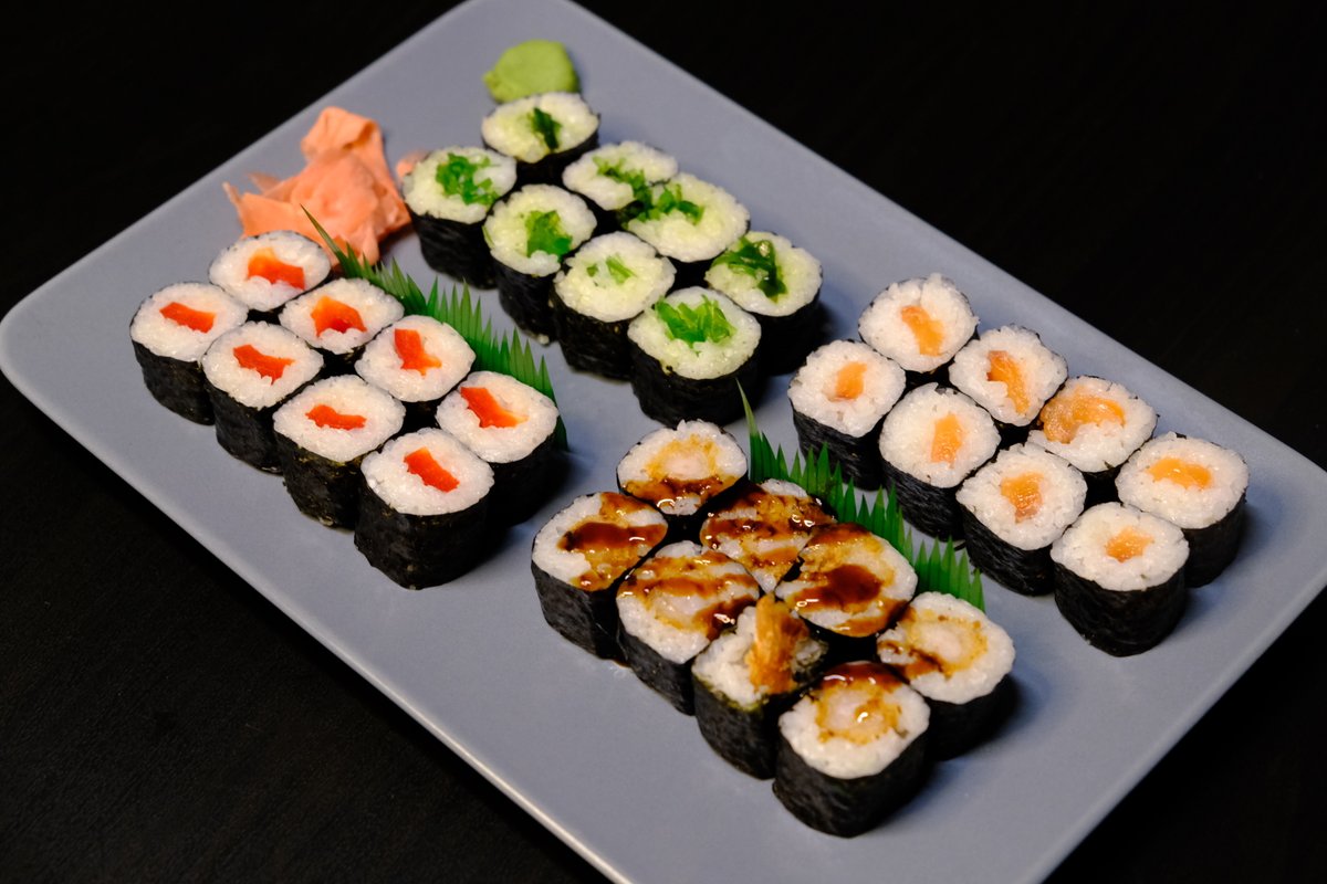 4db uborka maki, 4db lazac maki, 8db unagi uborka maki, 8db sárga retek maki