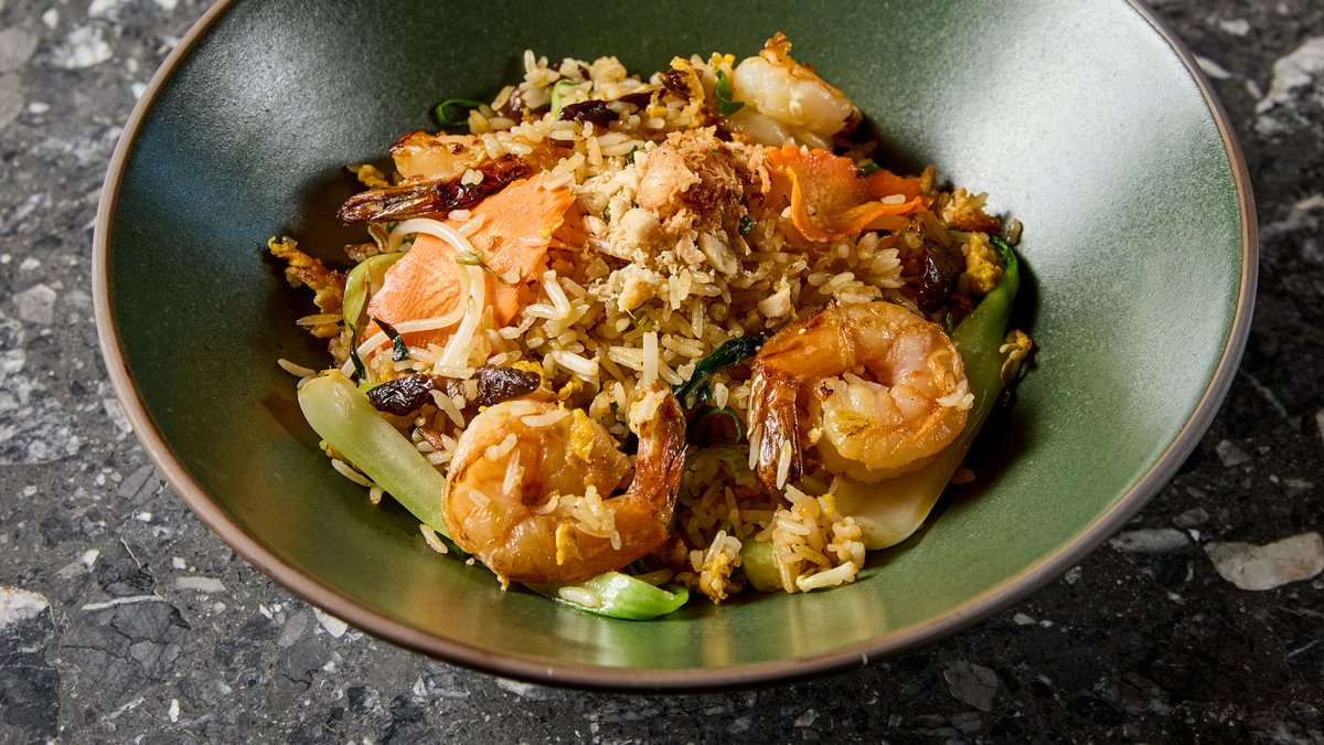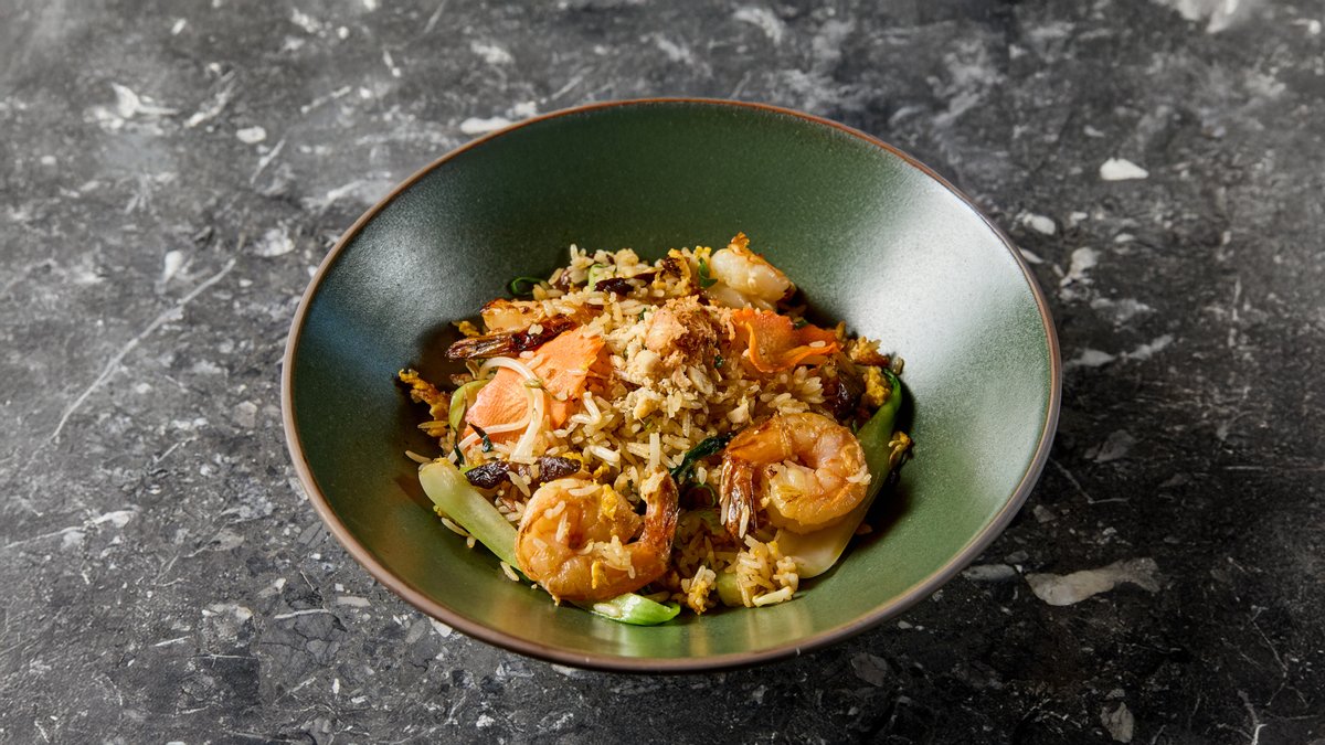 Rizs, pak choi, sárgarépa, shiitake, babcsíra, újhagyma, tojás, pirított hagyma, földimogyoró, tigrisrák